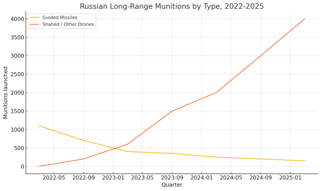 Facing depletion, Moscow shifted firepower architecture. S-300 surface-to-air missiles were redirected at ground targets, increasing miss distances, while Iranian-designed Shahed drones began to pad nightly salvos (Army Recognition, 2024). Guided-missile launches fell steadily while drone use soared, reaching an estimated total of four thousand deployed by the first quarter of 2025 (Atalan and Jensen, 2025). The identity of the high-tech precision striker gave way to the practicalities of magazine depth and industrial capacity.